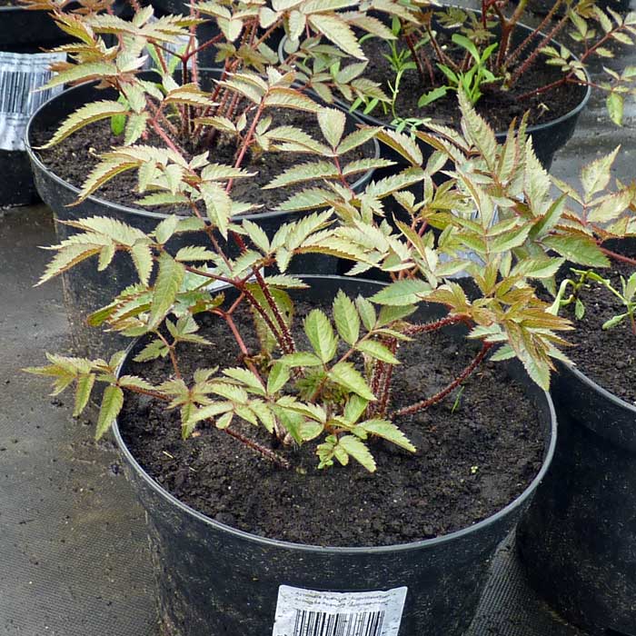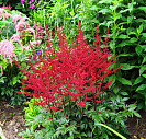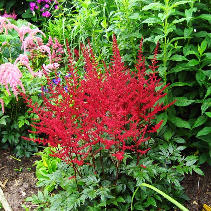 Благодаря красивому раскидистому кусту астильба декоративна весь сезон, даже вне периода цветения. Очень крупные насыщенно-красные метёлки.