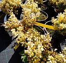 Листья мелкие, округлые, плотно расположены на побегах, желтовато-зеленого цвета.