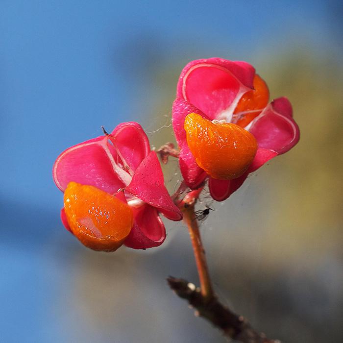 Плод бересклета - это сухая, кожистая, обычно четырехраздельная коробочка красно-оранжевых тонов.