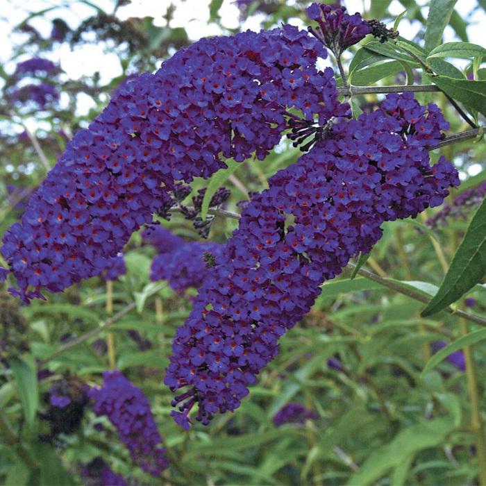 Цветки темно-синие, очень ароматные, собраны в крупные соцветия до 30 см длиной, окружаемые бабочками. Цветут от июля до октября.