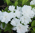 Цветет в июне-июле. Цветки белые, махровые, диаметром до 4 см, с приятным сладким ароматом.