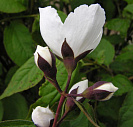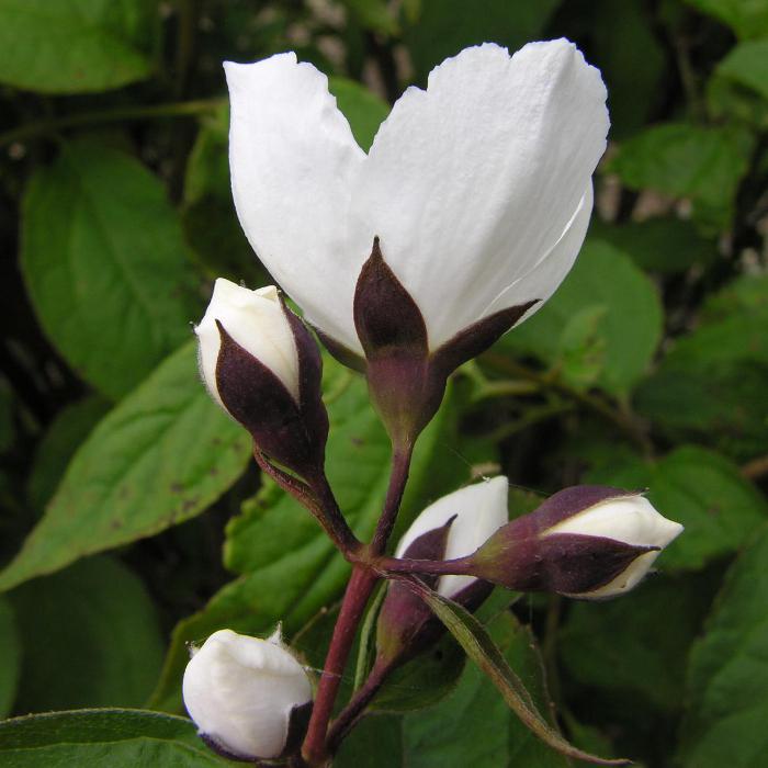Цветки диаметром 5-5,5 см, белоснежные, сильно контрастируют с багрянисто-чёрной чашечкой, собраны по 3-7 в кистевидные соцветия, аромат сильный, цветёт обильно в июне-июле.