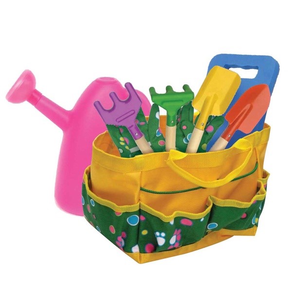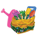В набор входит сумка для инструментов, фартук, садовая шляпа, перчатки, лейка, коврик под колено, лопатка, грабли.