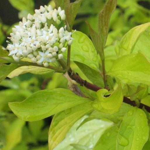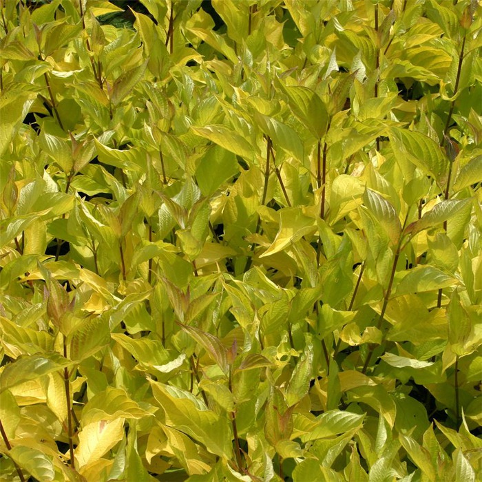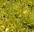 Молодые листья — коричневато-бордовые. Листья широкоовальные, шире, чем у остальных сортов, приятного нежно-желтого цвета, матовые. Осенью незначительно краснеют. Побеги прямостоячие красновато — бордовые.