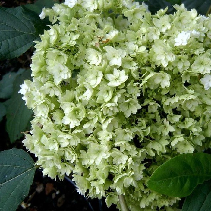 Куполообразное соцветие состоит из стерильных сильно махровых цветков, имеющих форму звездочек. Вначале соцветие имеет салатовый оттенок, затем снежно-белый, к концу цветения снова зеленеет. Цветение – с середины июня до сентября.