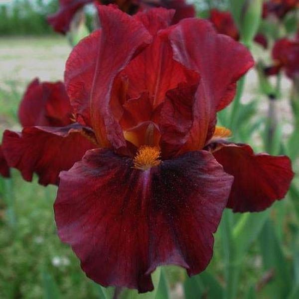 Шикарные крупные цветы бордово-красного оттенка с медно-желтой бородкой в основании нижних гофрированных лепестков. Диаметр соцветия 12-15 см.
