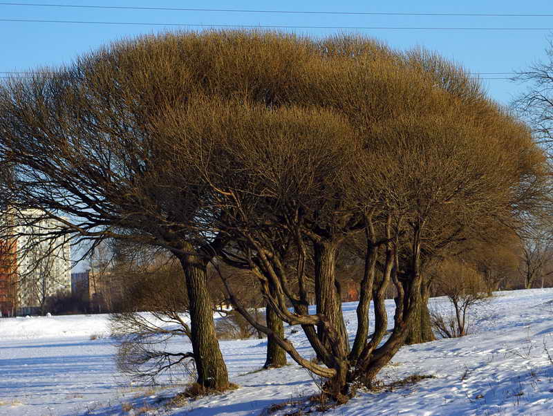 Крона густая, часто метловидная. Боковые побеги отходят под почти прямым углом, очень ломкие в основании, верхние побеги менее ломкие.