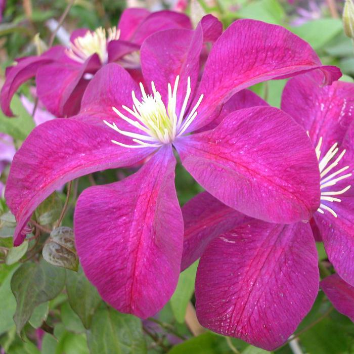 Большие бархатные тёмные лилово-красные цветы по 12-15 см с красной полосой на лепестках и с желтыми пыльниками.