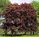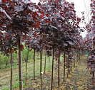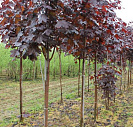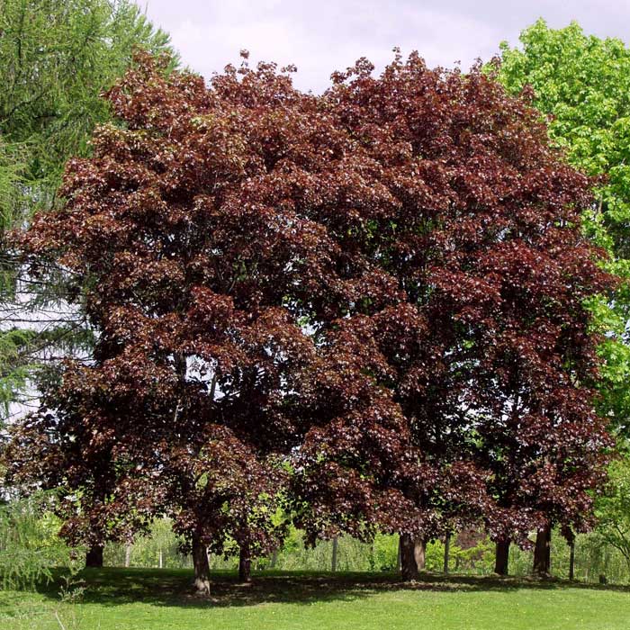 Листья пятилопастные, при распускании они имеют светло-красную окраску, затем ее насыщенность увеличивается, и они становятся блестящими, почти черными, с пурпурно-фиолетовым оттенком. Цвет листьев сохраняется до листопада.