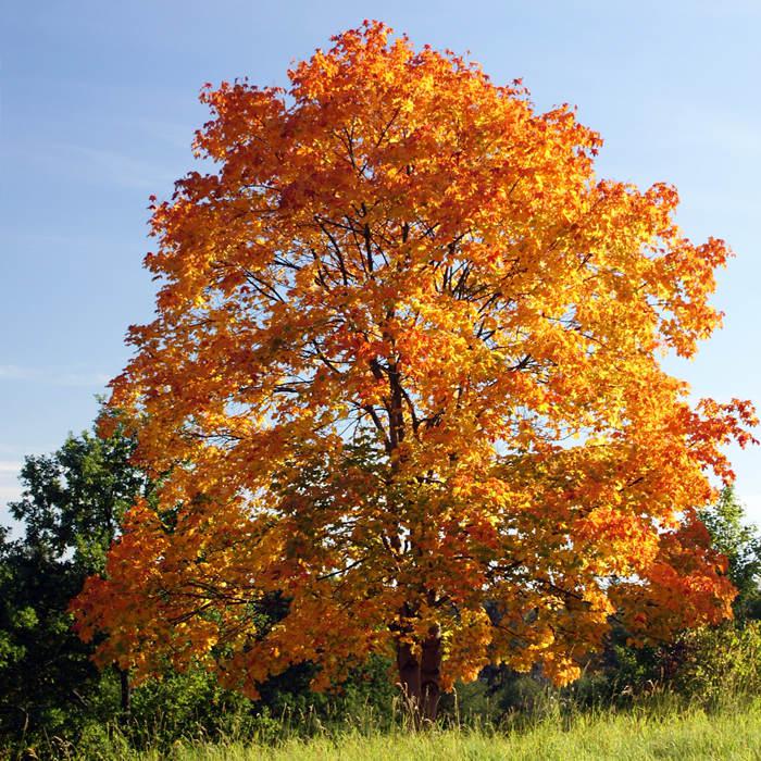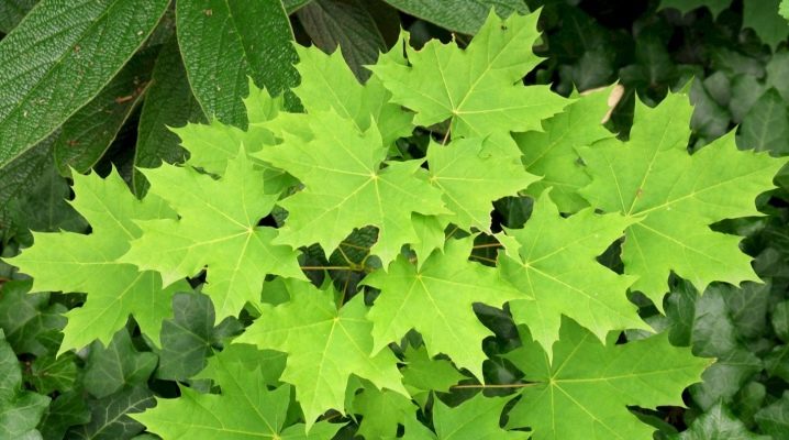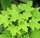 Крупные, до 18 см, пятилопастные, темно-зеленые листья осенью окрашиваются в оранжево-желтые тона.