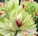 Цветки крупные, махровые, диаметром 16 см, светло-салатовые, в центре темный крап, растущие вверх и в бок.