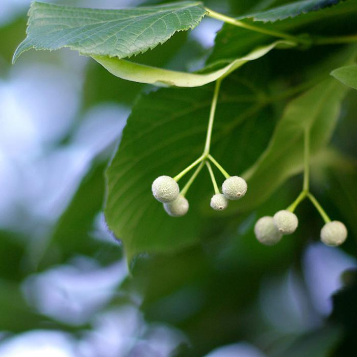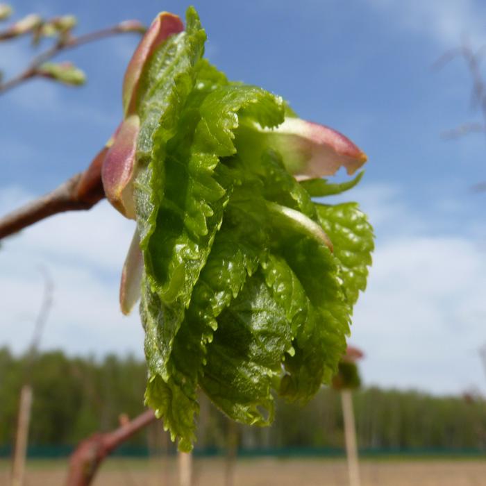 Листья до 6 см, сердцевидные, с оттянутой верхушкой, сверху темно-зеленые, голые, иногда блестящие, с нижней стороны — сизоватые, на черешках до 3 см длиной; осенью они принимают красивую светло-желтую окраску.