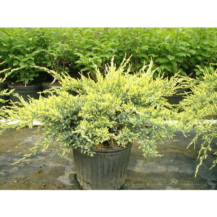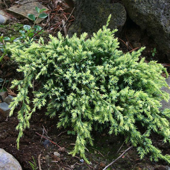 Необычное сочетание желтых концов побегов с основной серебристой окраской.
