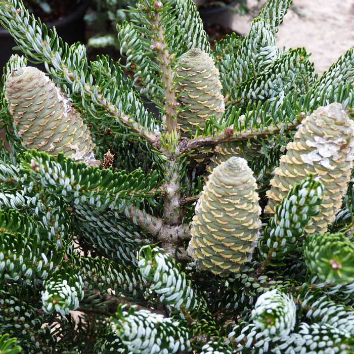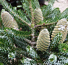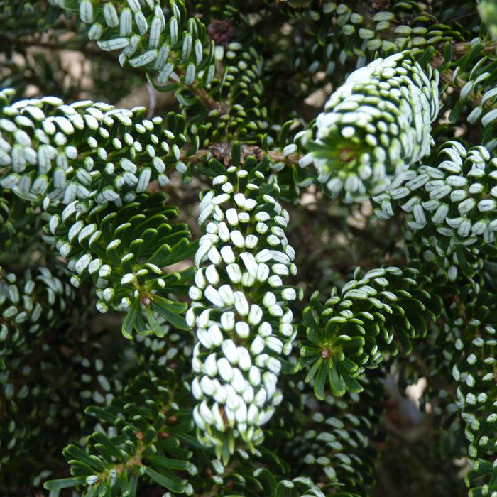 Хвоя сине-зеленая, концы иголок на ветвях немного заворачиваются к стволу, приоткрывая белую изнанку.