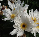 Цветок кремово-белый, простой и полумахровый, плоский, с длинными узкими, изрезанными лепестками.