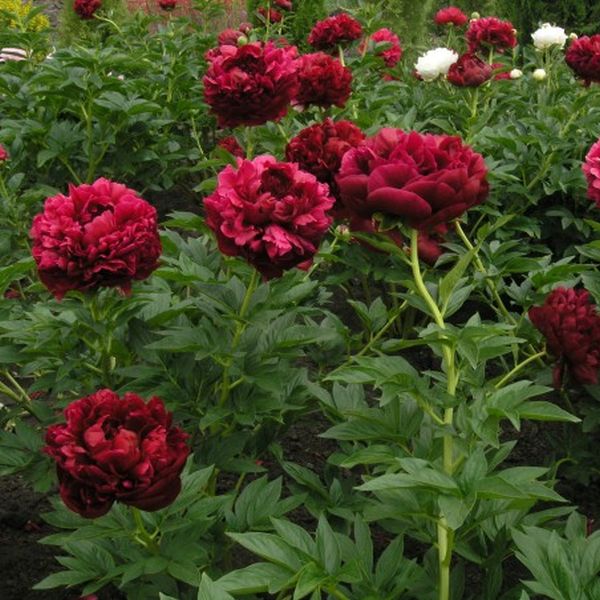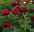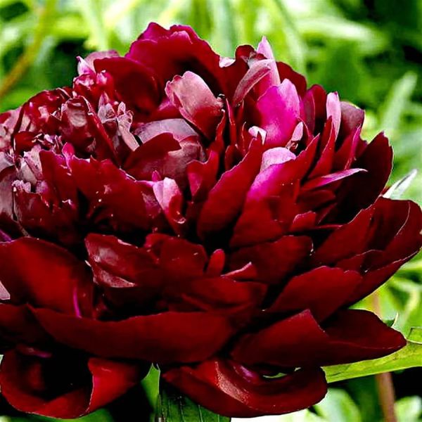 Один из самых тёмных сортов среди бордовых пионов. Махровые цветки состоят из многочисленных атласных лепестков! Их диаметр – около 20 см.