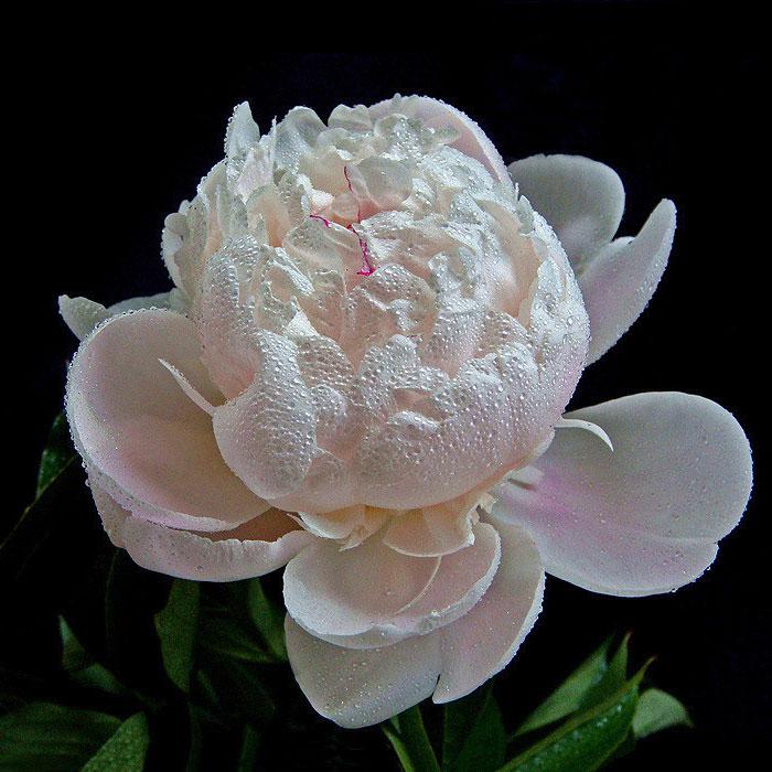 Махровый шаровидный. Цветок диаметром 18 см, очень плотный, при роспуске нежно-розовый, позднее чисто-белый. Лепестки прямые выемчатые.