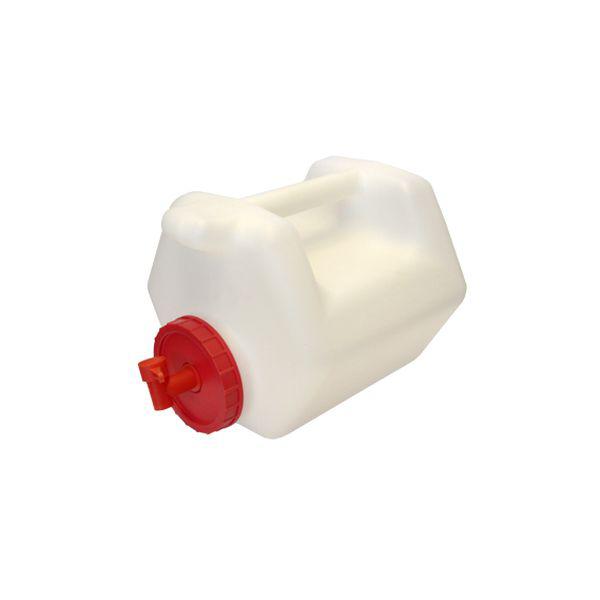 Форма канистры позволяет вертикальное и горизонтальное размещение, т.к. емкость имеет несколько опорных сторон. На крышке канистры имеется краник-носик.