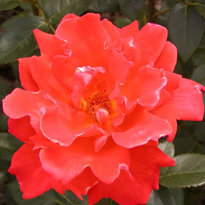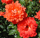 Цветок оранжево-красный, с высоким центром, махровый, 25 - 40 лепестков в одном цветке, диаметр цветка 10 - 11 см, обладает легким ароматом.