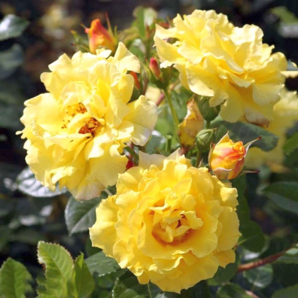 Цветки желтые, чашевидные, с красивыми золотистыми тычинками в центре. Едва раскрывшись, цветки ярко-желтые, затем выгорают до лимонных. Появляются в кистях по 5-15 шт.