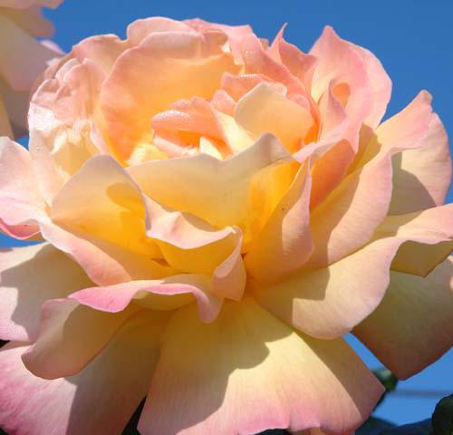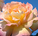 Цветок золотисто-желтый с розовым налетом по краям лепестков, обратная сторона лепестков бело-кремовая, чашевидный, с высоким центром, махровый, 40 - 45 лепестков в одном цветке, диаметр цветка – 15 - 19 см, обладает легким фруктовым ароматом.
