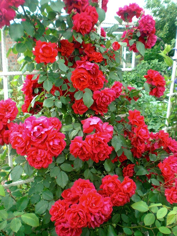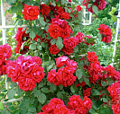 Цветки состоят из около 30 лепестков яркого, но не кричащего красного цвета, хорошей формы, средних размеров (6-7 см), полумахровые, с легким ароматом.