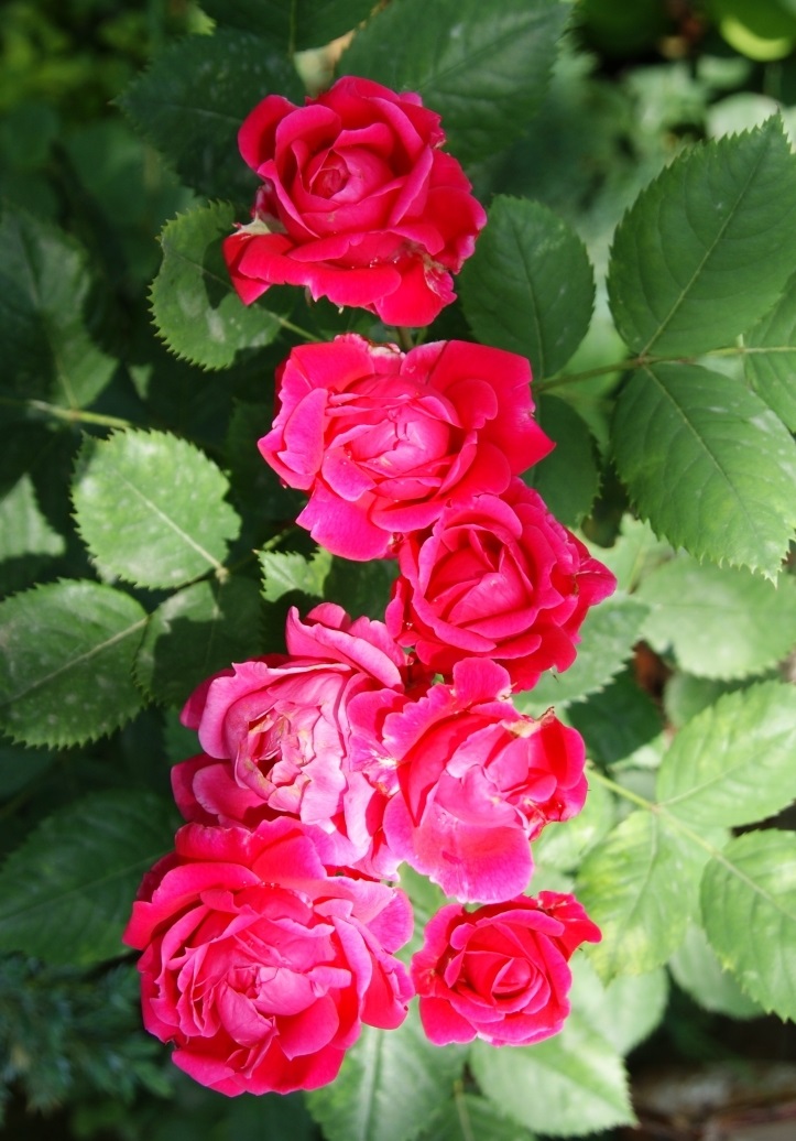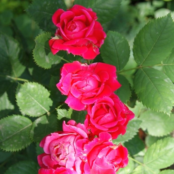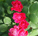 Цветки яркого красного цвета, махровые. Собраны в кисти по 5-15шт. Размер цветка в диаметре 5-7 см. Цветет двумя явно выраженными волнами, между которыми на розе могут появляться одиночные цветки. Эта роза слегка пахнет клубникой.