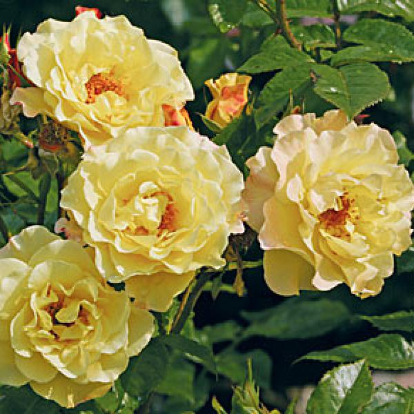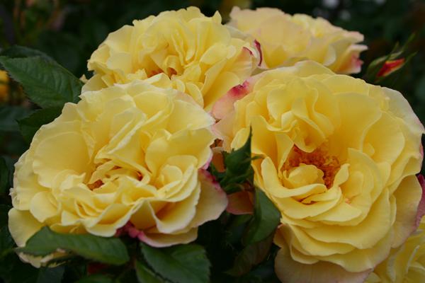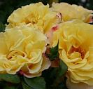 Цветок лимонно-желтый с красными волнистыми краями лепестков, чашевидный, густомахровый, 70-75 лепестков в одном цветке, чашевидный, диаметр цветка 9 см, обладает насыщенным ароматом шиповника.
