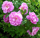 Цветки ярко-розовые, крупные, махровые, ароматные. Лепестки уложены в изящном беспорядке. Появляются в большом количестве, по одному или в кистях до 5 шт.