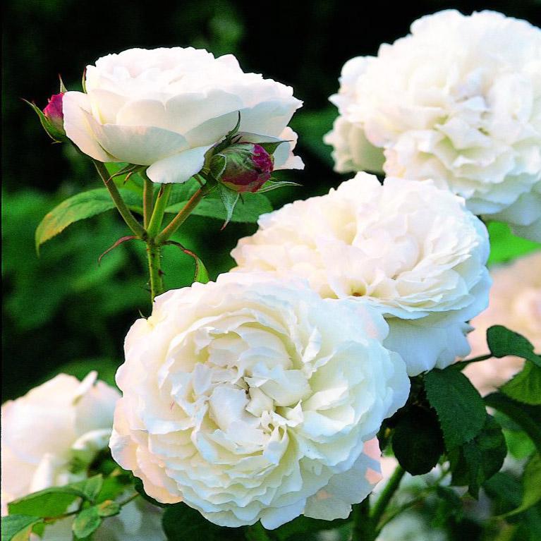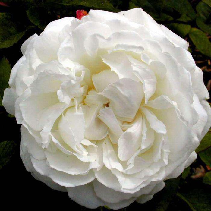 Цветок чисто-белый, иногда встречается розовый, чашевидный, густомахровый, диаметр цветка 7-9 см, обладает ароматом старой розы с оттенком меда и миндаля.