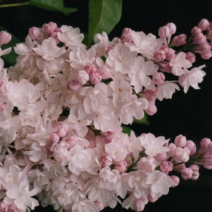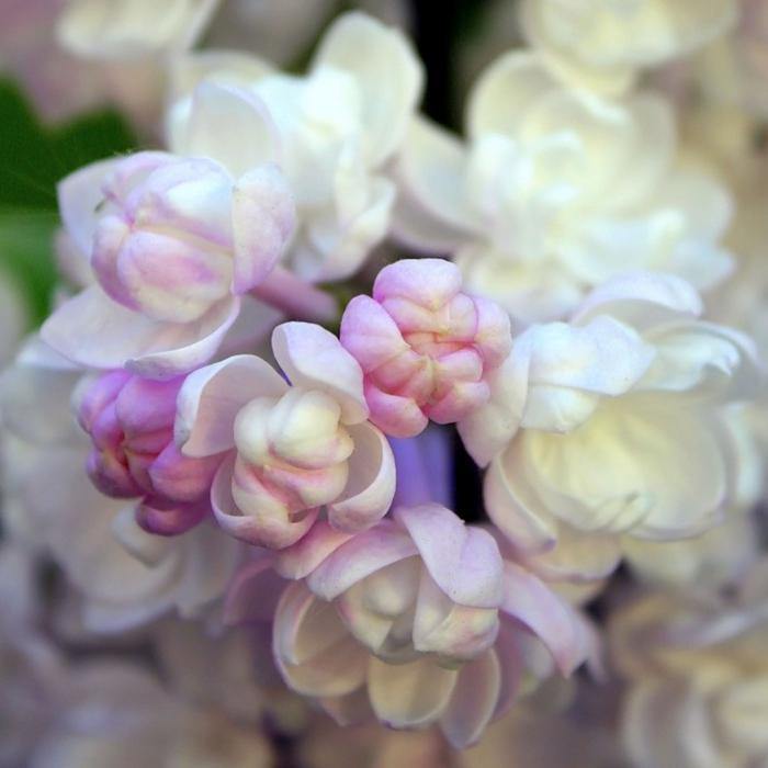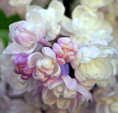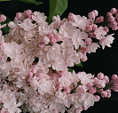 Цветет в конце мая - начале июня. Бутоны крупные розово-лиловые, цветки розовато-белые с перламутровым оттенком, крупные, махровые. Крупные цветки собраны в плотные душистые соцветия.