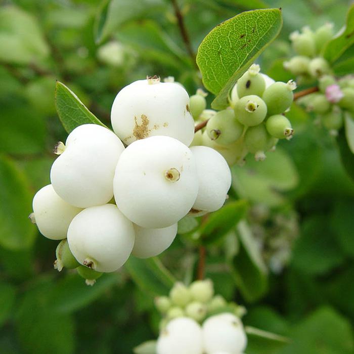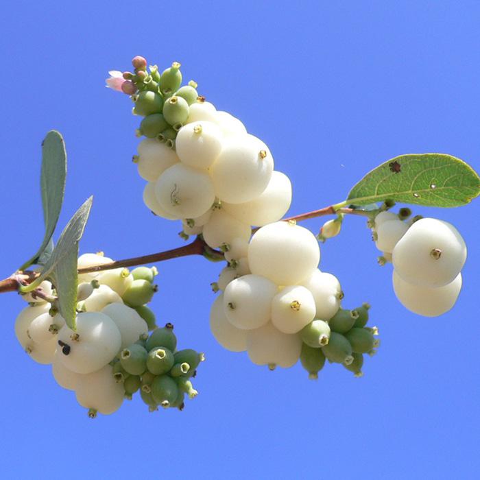 Плоды белые, круглые, в геометрически правильных гроздьях, долго сохраняются на кусте.