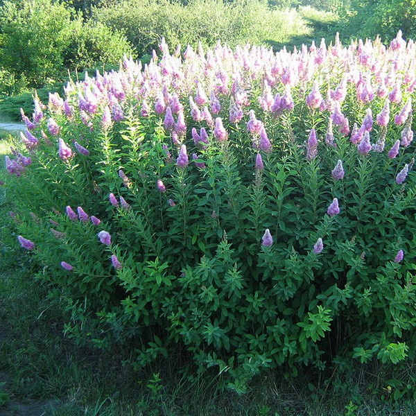 Начиная с пятой весны ежегодно обрезают всю верхнюю часть куста, оставляя пеньки высотой 30 см. После этого побеги активно отрастают. Они одновременно зацветают и под тяжестью соцветий несколько отклоняются в стороны, образуя розовый цветочный фонтан. Чтобы «фонтан» не стал однобоким, спирею нужно сажать на освещенное со всех сторон место, желательно защищенное от сквозняков. Если куст сильно разваливается, особенно после дождя, можно поддержать его, укрепив вокруг него на нужной высоте согнутый в кольцо отрезок пластиковой трубки или металлического прутка.