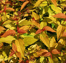 Листья 3-5 см, зазубренные. Молодые листья медно-оранжевые, летом листья желтые. Осенняя окраска листьев-медно-оранжевая. Иногда появляются пестрые листья.