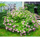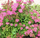 Бутоны карминного цвета. Цветки насыщенно-розовые, в больших, плоских соцветиях.