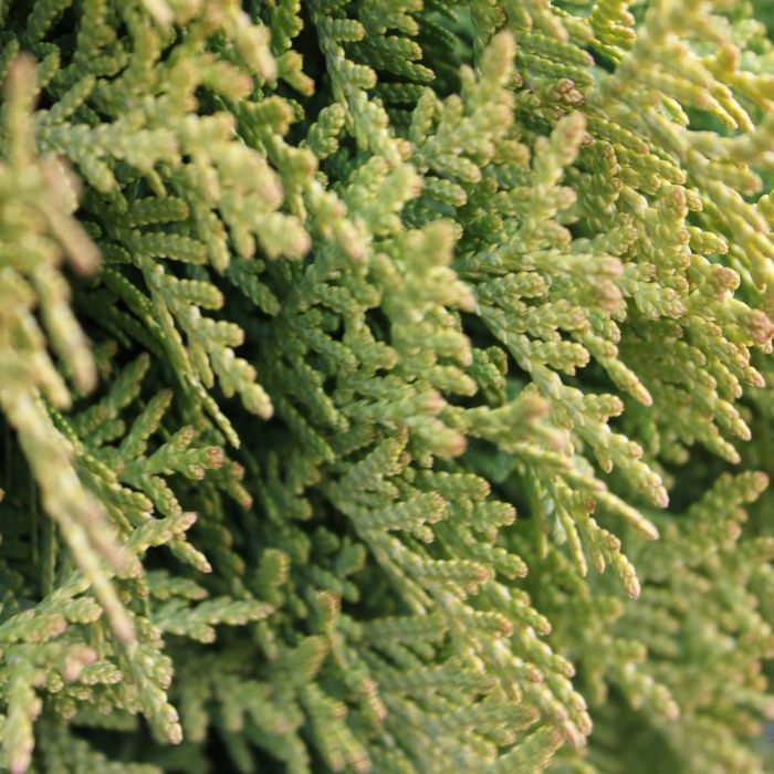 Хвоя густая, золотисто-зеленая, зимой зелено-оранжевая с бронзовым оттенком.