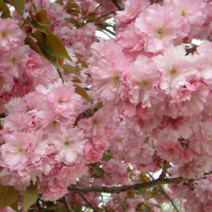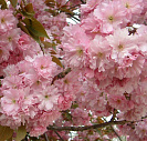 Цветет в мае. Цветки махровые, душистые, карминового цвета, 6 см диаметром, собраны в свисающие длинные соцветия.
