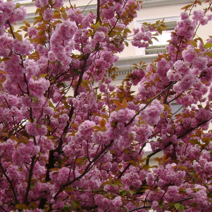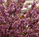 Цветки среднего размера, без запаха, нежно-розового цвета, махровые. Распускаются до листьев в апреле-мае. Цветет очень обильно.