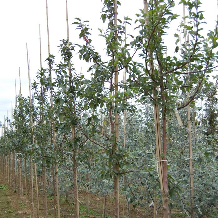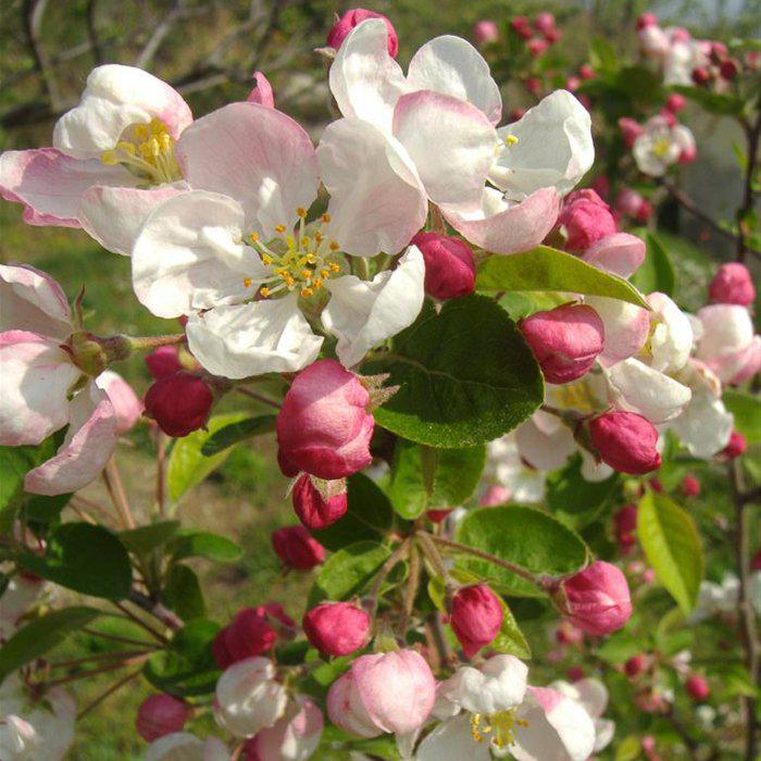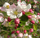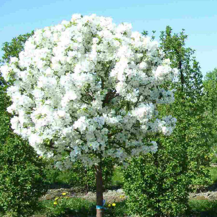 Отличается довольно рыхлой кроной с темно-зеленой листвой, простыми белыми цветками с розовыми полосками по краям лепестков, оранжево-красными с тонкой красной полосой плодами.