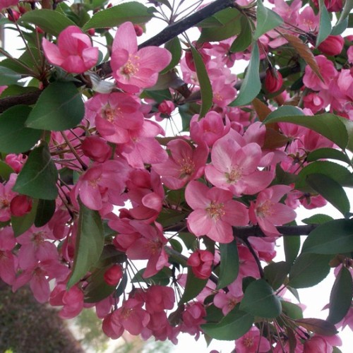 Цветёт в мае крупными тёмно-розовыми цветками.