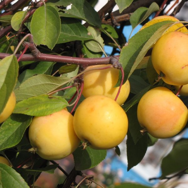 Кожица плодов гладкая, с глянцевым отливом, на поверхности можно разглядеть мелкие подкожные точки. Основной окрас у недозрелых яблок зеленовато-желтый, спелые плоды желтого цвета, с солнечной стороны нередко образовывается легкий, нежный бледно-розовый румянец.