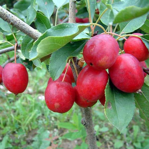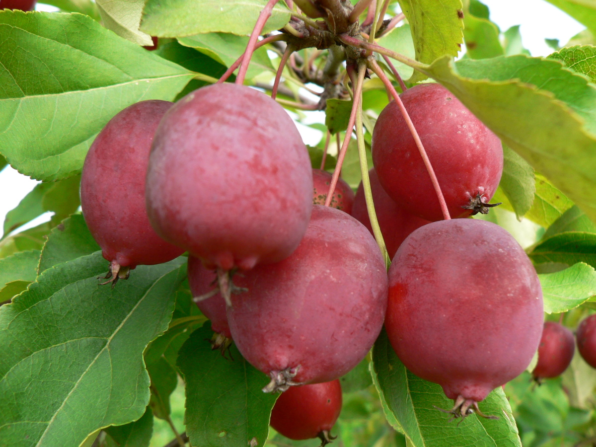 Вес яблока от 11 до 16 граммов, редко плоды достигают 20 — 25 г. Поверхность кожицы гладкая. Покровная окраска — насыщенная, сплошная, красного цвета, с густым налетом голубоватого оттенка. Форма плодов яйцевидная или овально-коническая похоже на сливу.