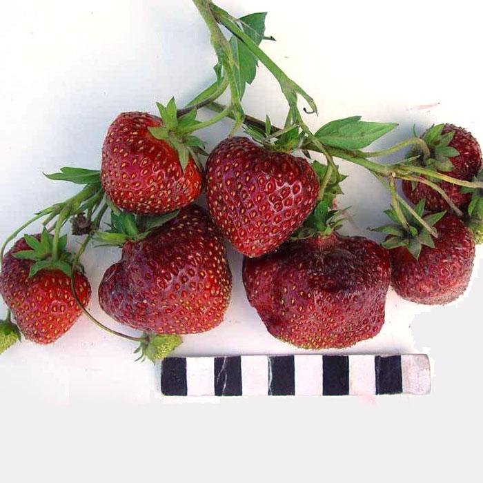 Ягоды первого сбора крупные (до 30 г), ширококонические, слегка сплюснутые с боков, без шейки, со слабовыраженной ребристостью. Последующие ягоды более правильной формы, со средней массой 12 г, ярко-красные с оранжевым оттенком, блестящие. Семянки наполовину погружены в мякоть.