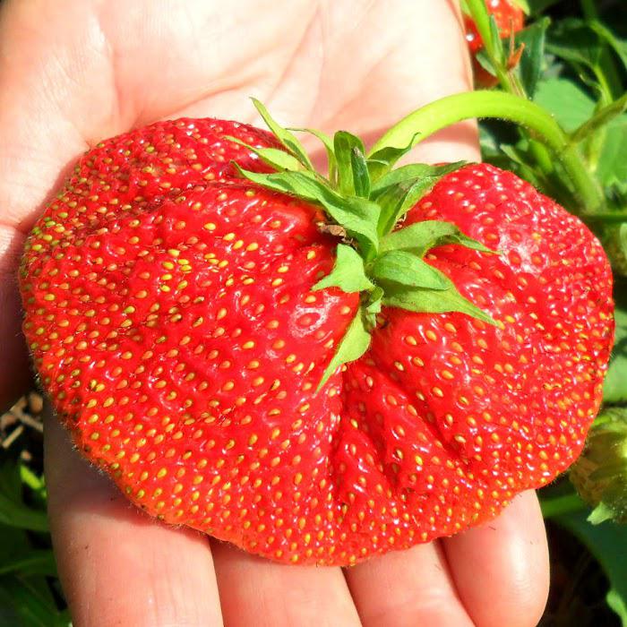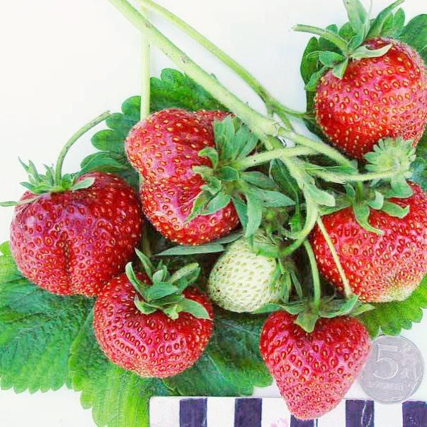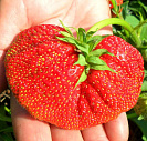 Ягоды темно-красного цвета, сдвоенные, с бороздкой посередине, очень крупные.