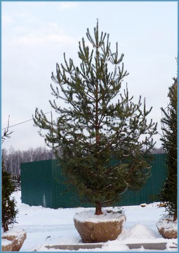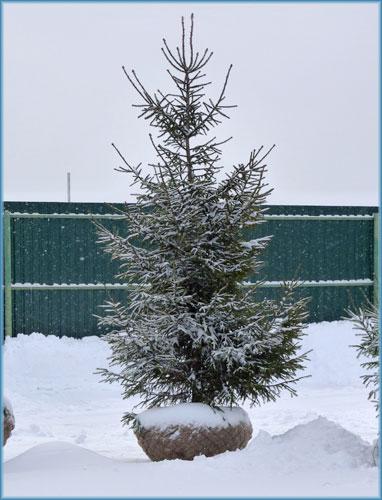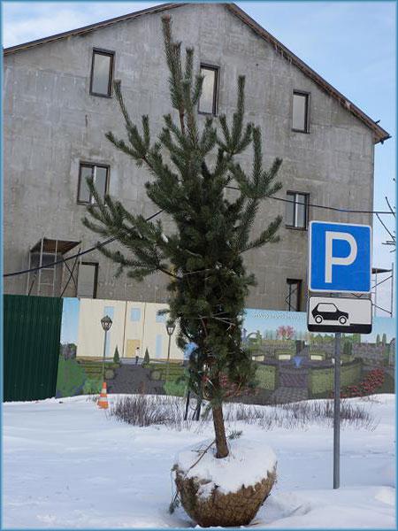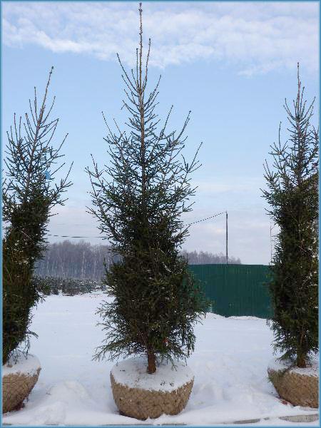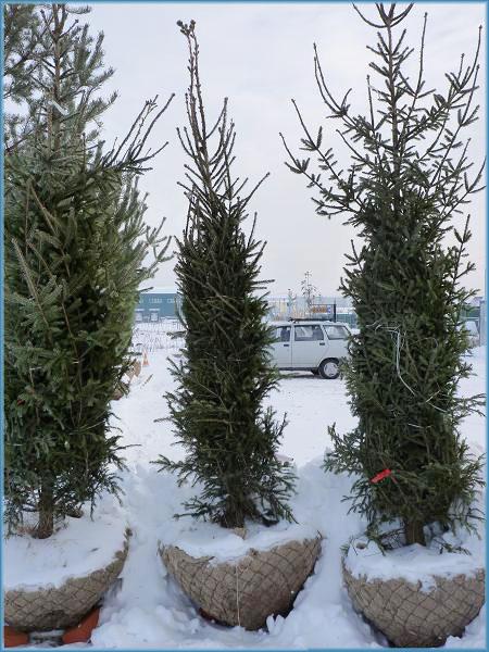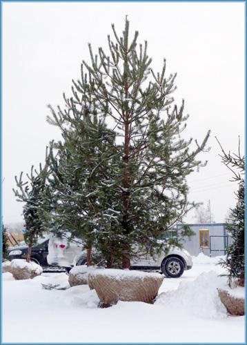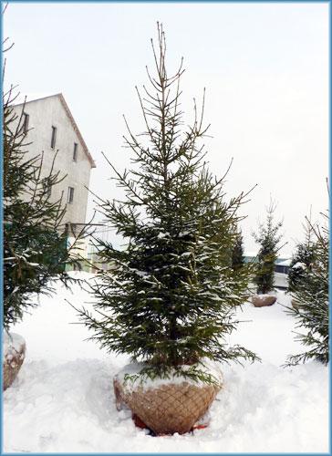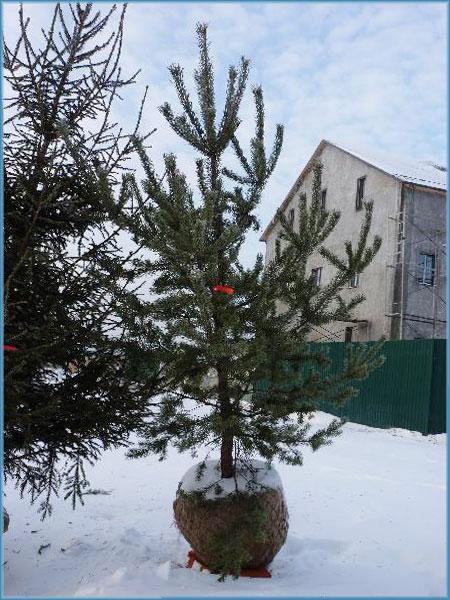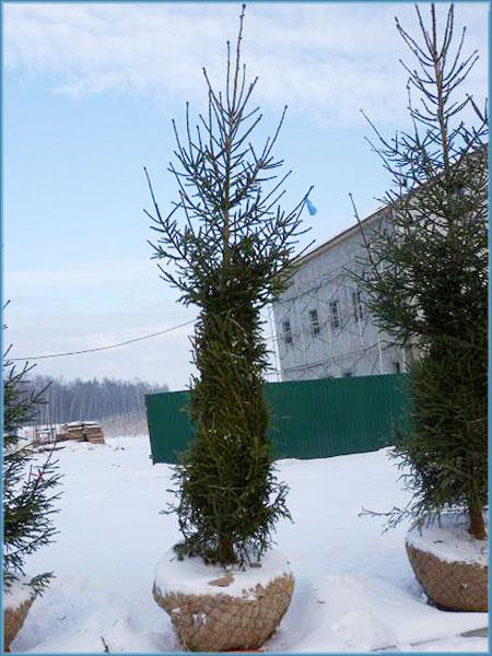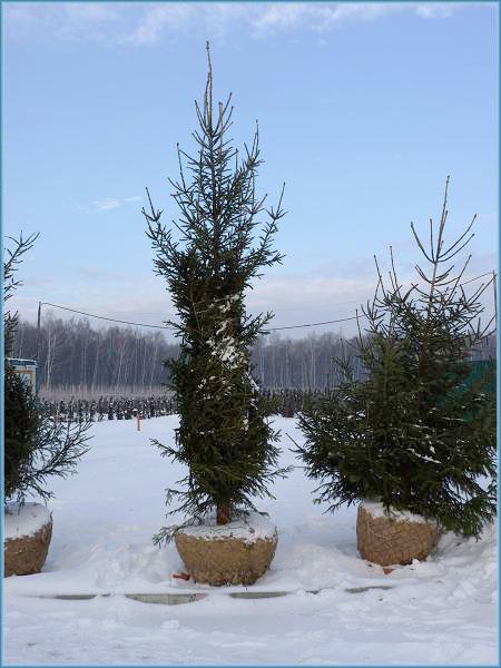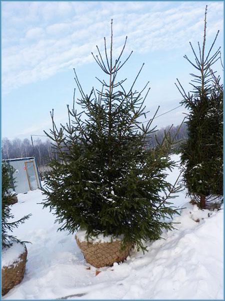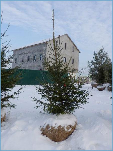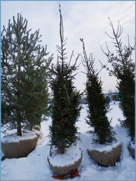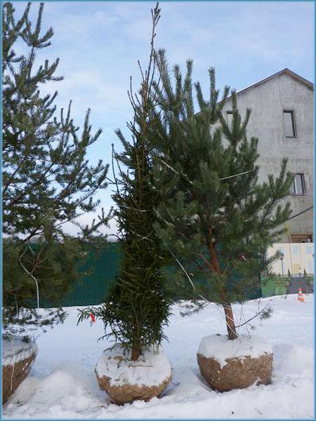 Хвойные деревья с комом для зимней посадки. Ель, сосна.