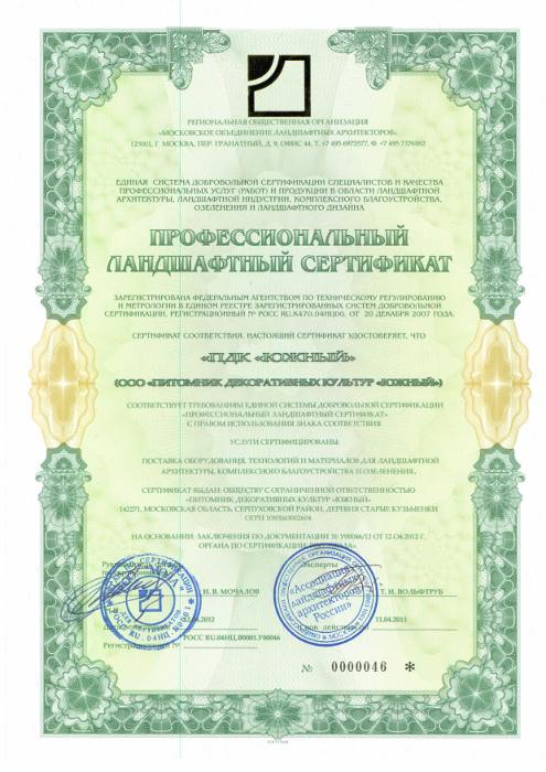 Система добровольной сертификации «Профессиональный ландшафтный сертификат» создана для оценки качества услуг, персонала, продукции и объектов ландшафта в РФ. Данная система дает независимую профессиональную оценку и критерии качества работ в области ландшафтной архитектуры.