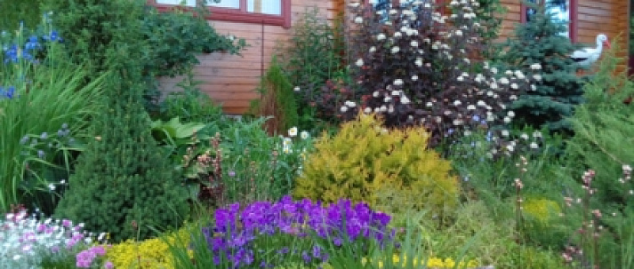 Это участок в тихой лесной зоне с чистым воздухом. На участке много взрослых берез. Участок сухой из-за своего местоположения и влияния берез, поэтому растения подбирали неприхотливые и засухоустойчивые, но в тоже время красиво цветущие или с декоративной листвой. Растения подобраны таким образом, что сад утопает в цвету на протяжении всего сезона. Сад получился естественный: лужайки, опушки, заросли кустарников, и в тоже время яркий.