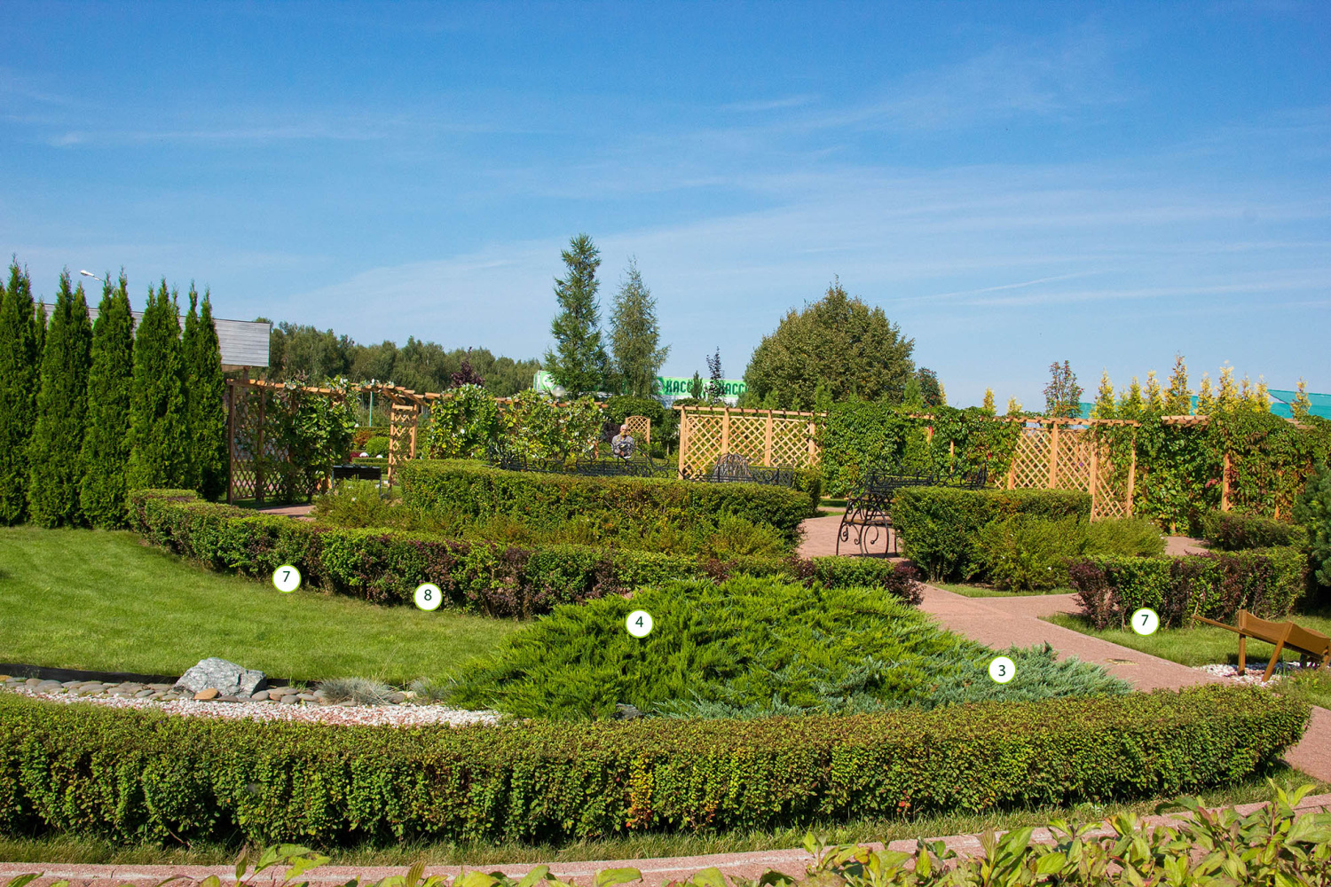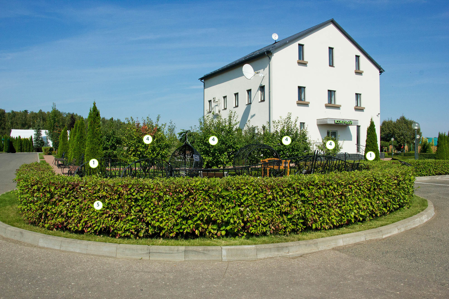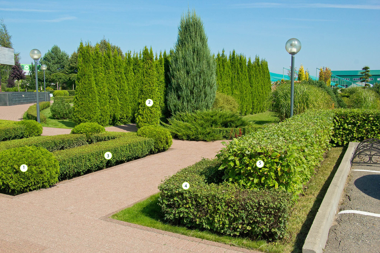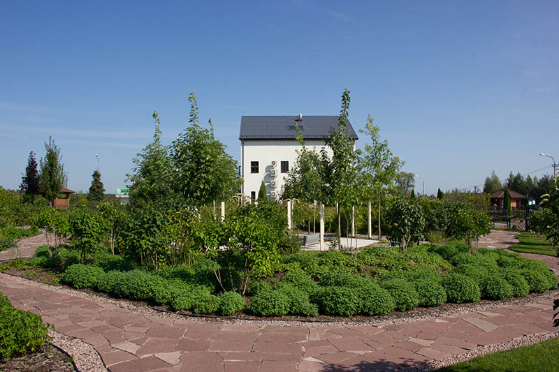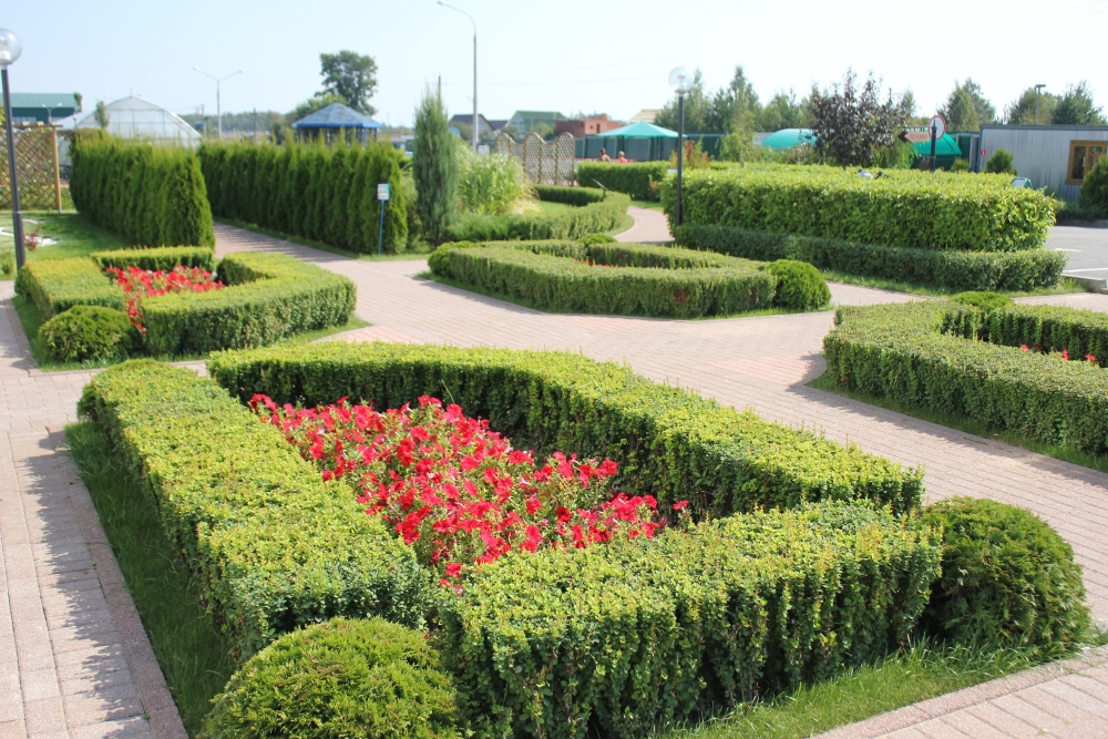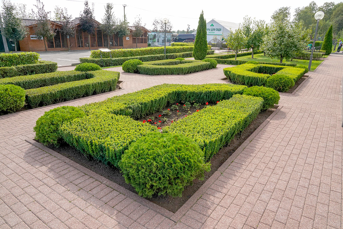 Данная зона благоустройства выполнена в смешном стиле, просматриваются элементы регулярного стиля, представленные живыми изгородями. Акцентами являются Ирга Ламарка, а также плакучие формы хвойных и лиственных видов.