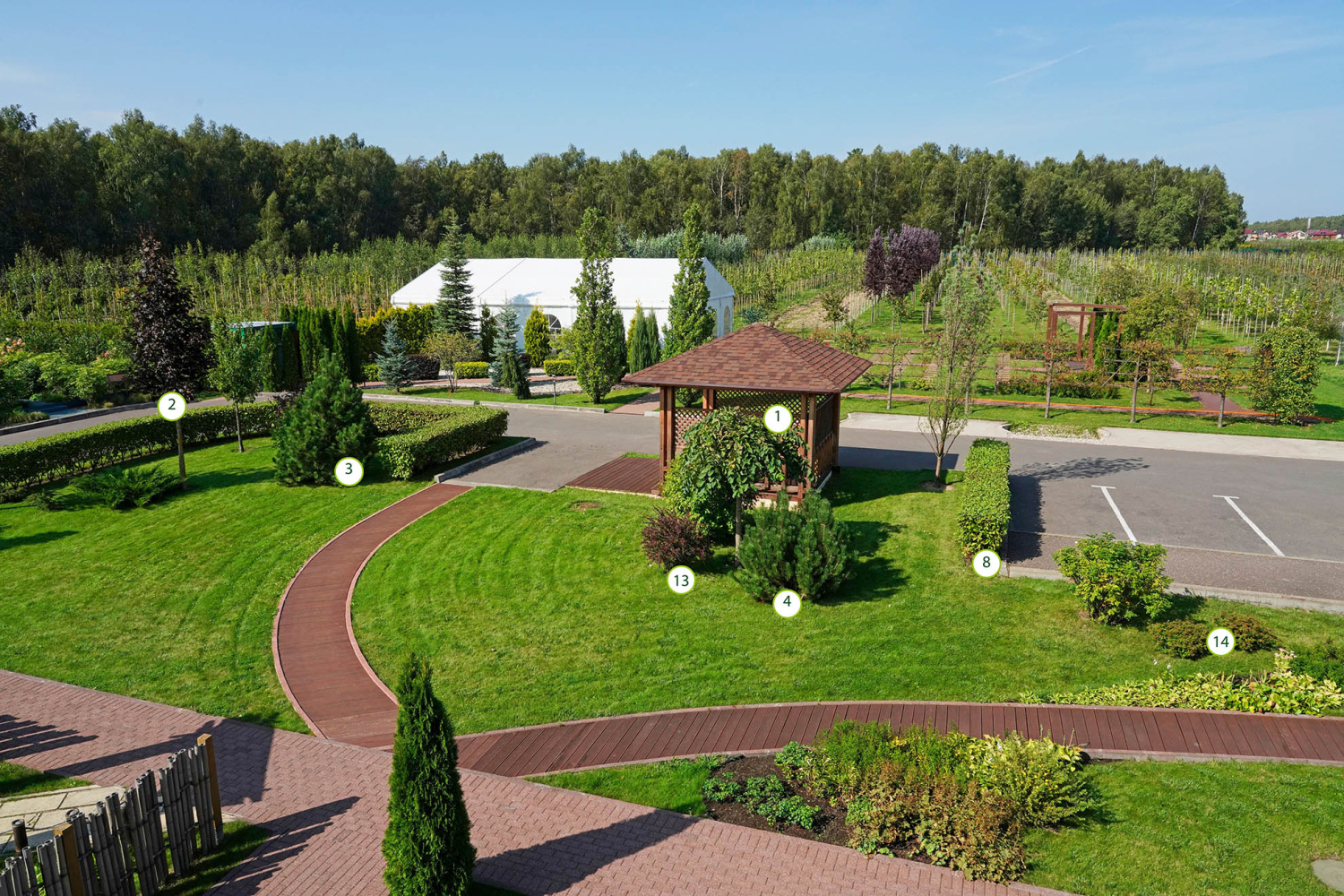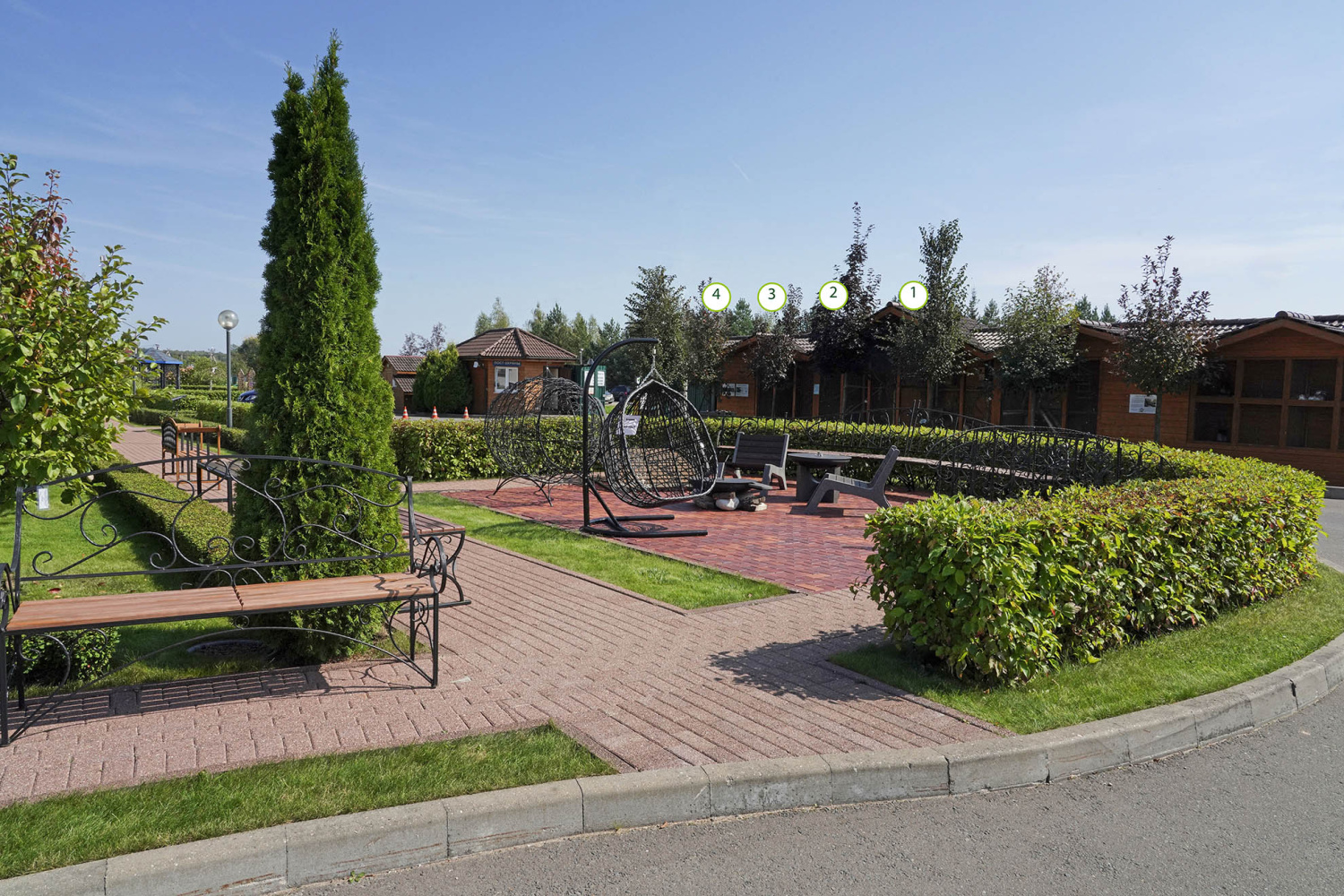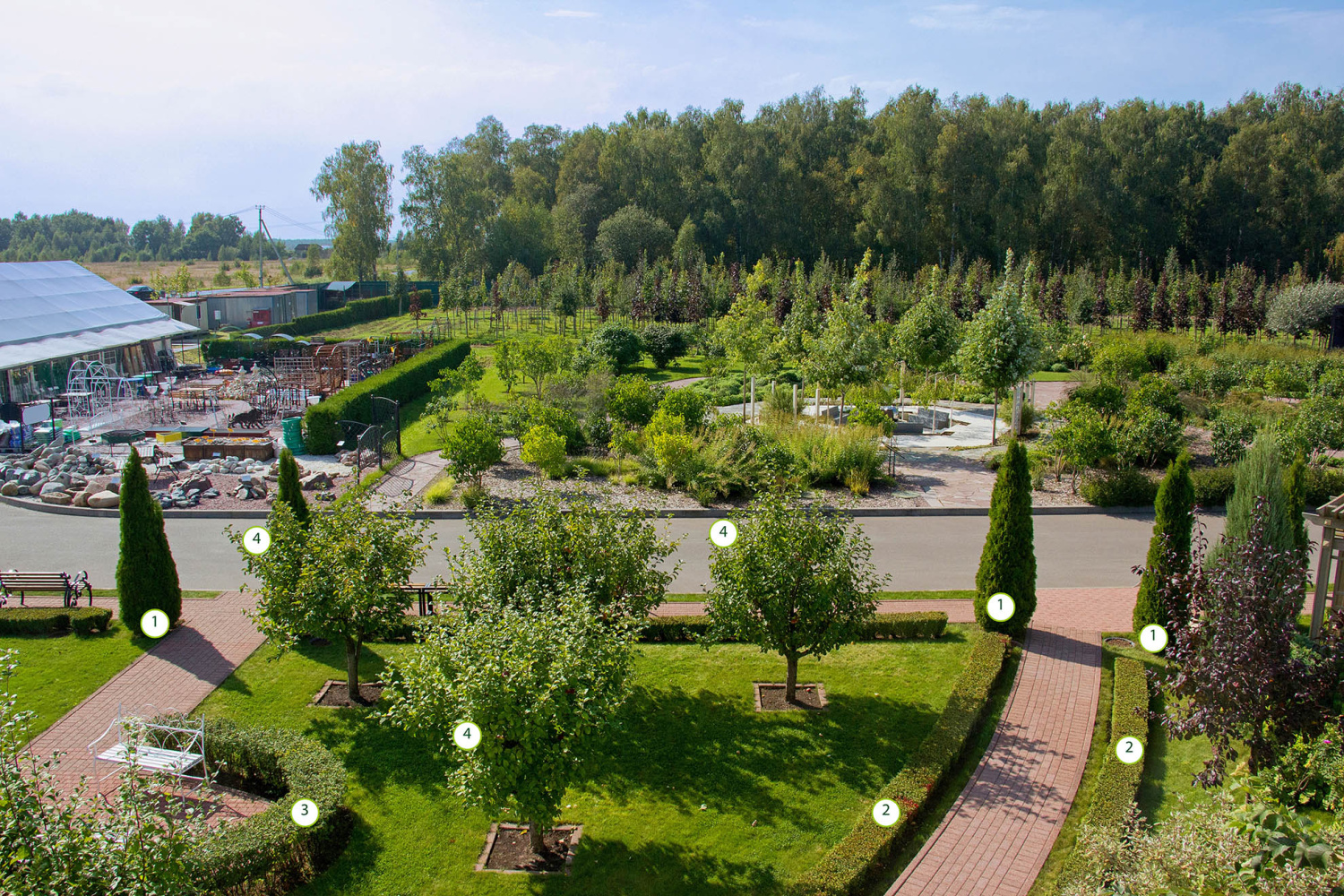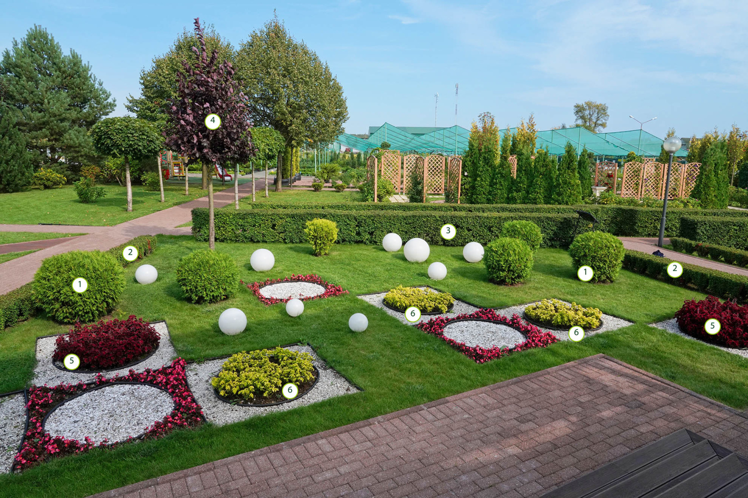 Данная зона благоустройства выполнена в смешном стиле, просматриваются элементы регулярного стиля, представленные живыми изгородями. Акцентами являются Ирга Ламарка, а также плакучие формы хвойных и лиственных видов.