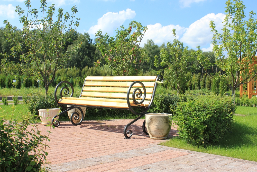 Плодовый сад – основа русского ландшафта, поэтому для него были выбраны традиционные сорта яблонь: «Папировка» и «Мелба» раннелетнего и летнего срока созревания, «Лобо» и «Вишневая» - зимнего. Чтобы любоваться яблоневым цветом и наблюдать за наливанием плодов, в саду устроена площадка и поставлена пара скамеек.